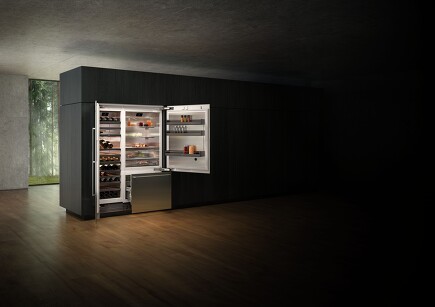 Die Geräte der Vario Kälte-Serie 400 überzeugen besonders, wenn sie zu einer markanten Kühlwand kombiniert werden. Grifflose Türen, individuelle Fronten sowie die Edelstahl- oder Glastüren der Weinklimaschränke setzen jede private Küche stilvoll in Szene. Die Ausstattung hinter den Türen ist komplett aus Edelstahl und eloxierten Aluminiumelementen in dunklem Anthrazit gefertigt. Die Kombination aus dezenten klaren Glasplatten, massiven Aluminium-Türabstellern und blendfreier warmweißer LED-Beleuchtung schafft eine eindrucksvolle Atmosphäre. (Bildquelle: Gaggenau)